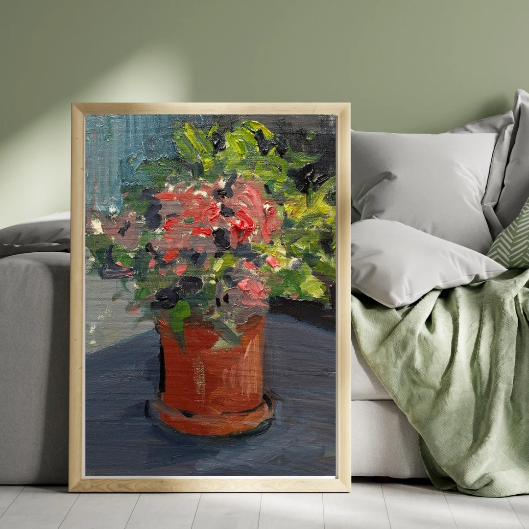 A potted plant painted in an impressionist style, with expressive brushstrokes that bring out bold pink and red flowers surrounded by green leaves. The pot is a warm reddish-brown color, set on a saucer against a dark surface. The background of muted blues and grays creates contrast, making the flowers feel lively and welcoming. The thick strokes add texture and movement, giving the piece a warming presence that feels both natural and expressive.